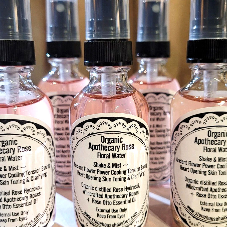 Our Apothecary Rose Floral Water is Organic, steam distilled & infused with wild crafted local Heritage Apothecary Roses hand harvested, preserved & formulated.